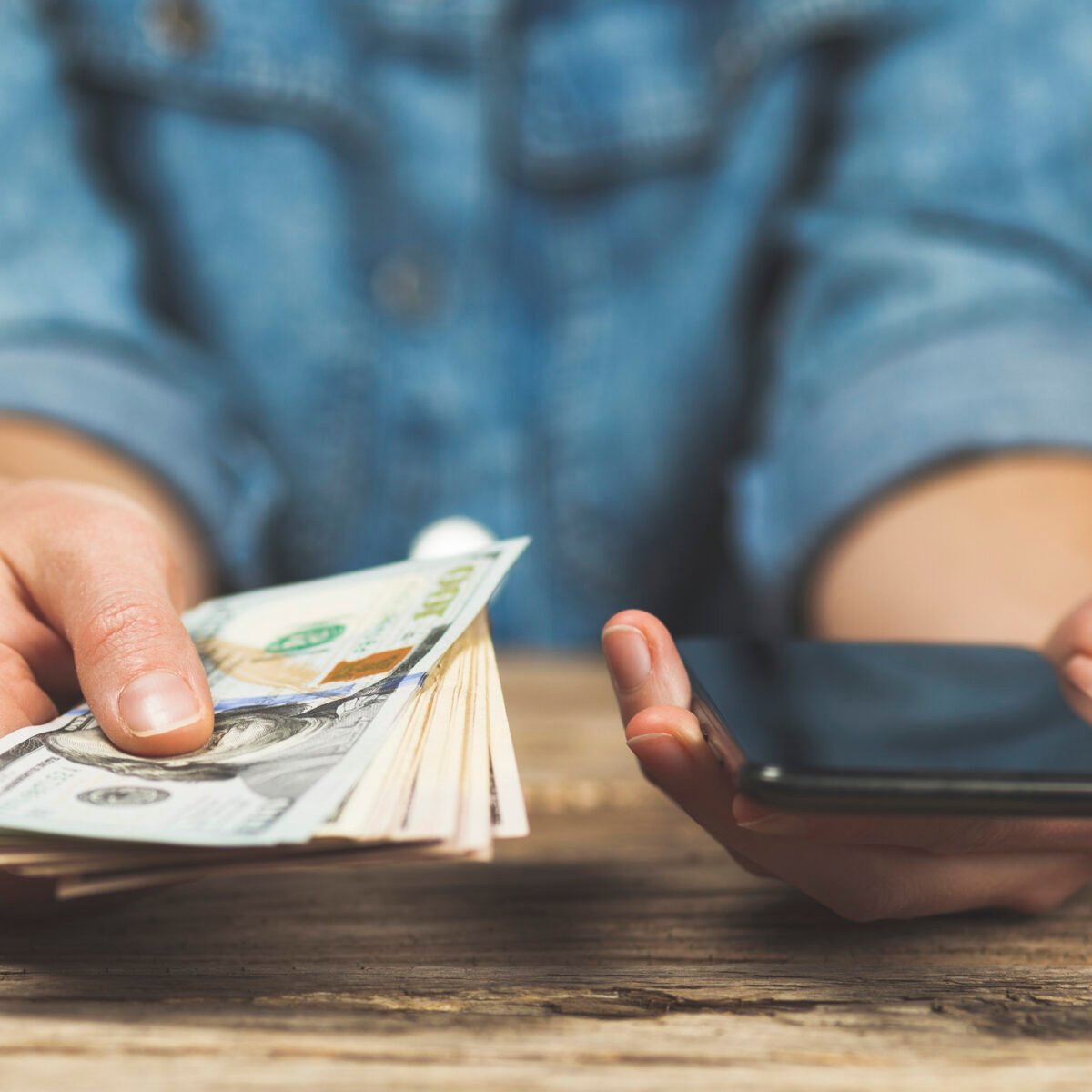 A person holding a phone in one hand and cash in the other.
