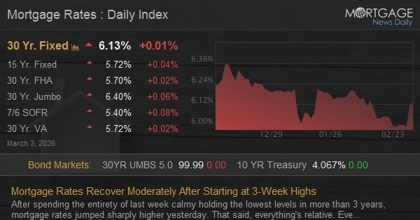 Bonds ended up making it almost all the way back to ‘unchanged,’ thus allowing most lenders to reissue revised rates that were slightly lower than this morning. The average lender didn’t make it quite back to yesterday’s latest levels, but the market movement offered an important proof of concept. Specifically, we’re not necessarily destined to see a runaway rate spike in the coming days.