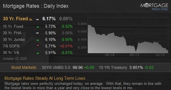 Mortgage rates were perfectly unchanged today, on average. With that, they remain in line with the lowest levels in more than a year and very close to the lowest levels in more than 3 years.