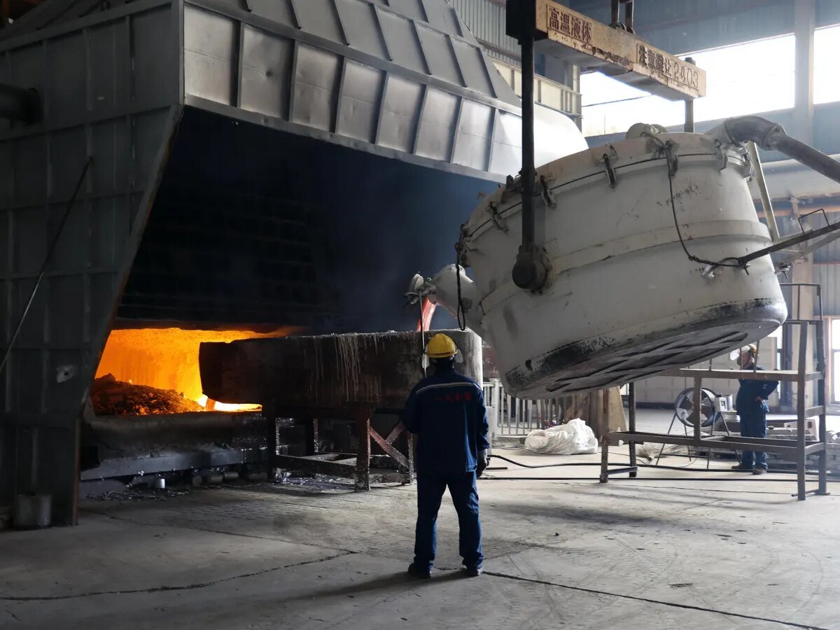 Molten aluminum is poured into a furnace at the workshop of an aluminum product manufacturing enterprise on May 13, 2025 in Binzhou, Shandong Province of China. (Photo by Chu Baorui/VCG via Getty Images)